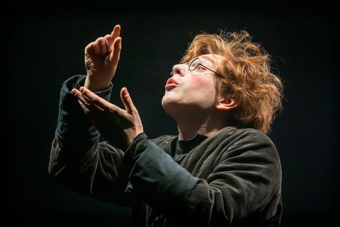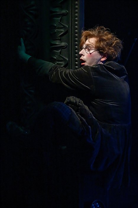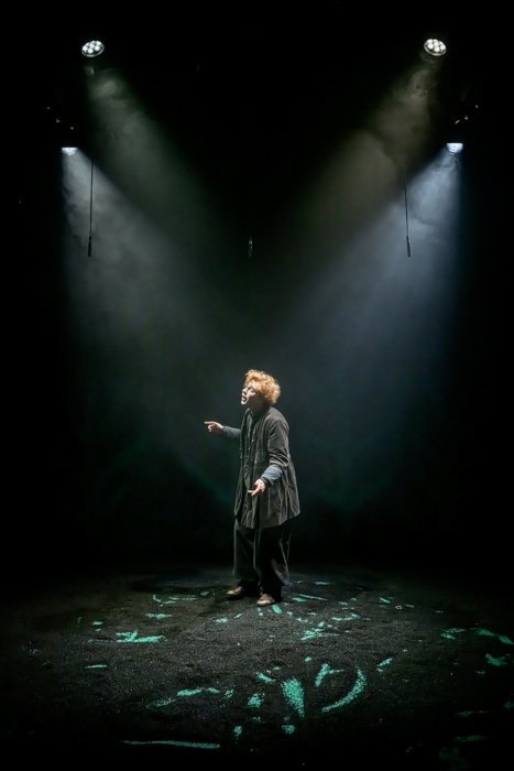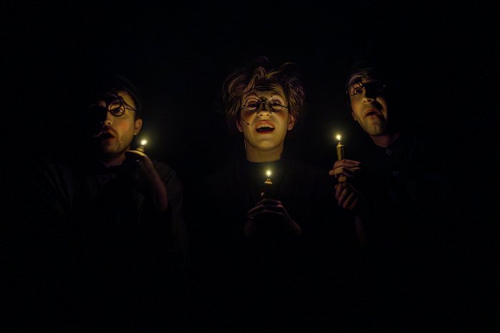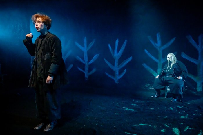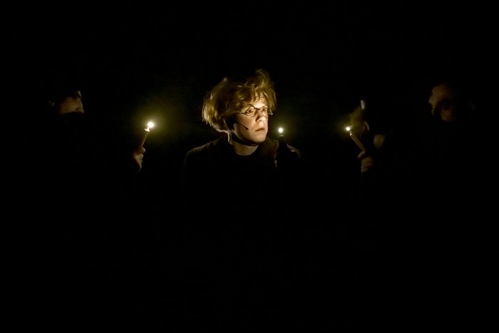 В начале, в одном из самых завораживающих моментов спектакля, сцена и зал погружены во мглу, и герои, как светлячки, появляются в ее глубине. Три чудных, наивных семинариста ищут ночлег. У героев, в том числе у Хомы, гиперболизировано детские и наивные голос, мимика, внешность. Они будто сошли со страниц сказки и вот-вот будут кем-то съедены.