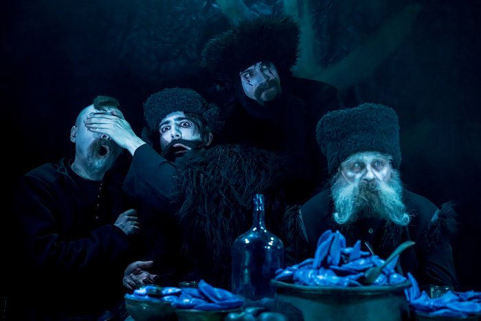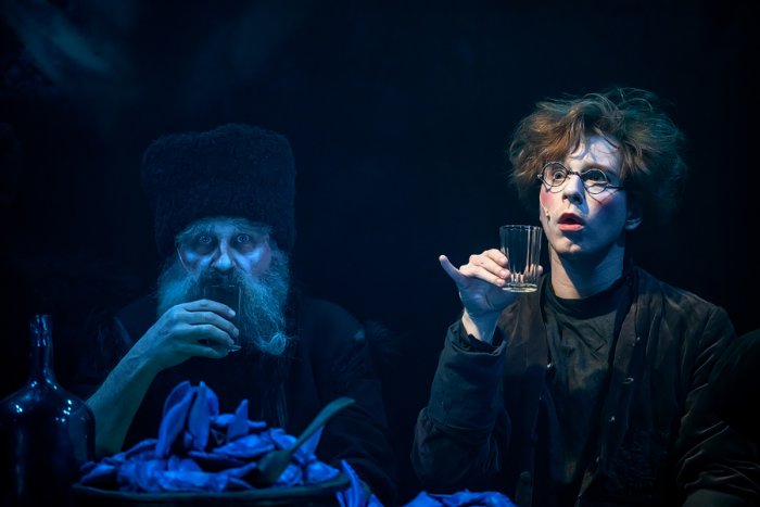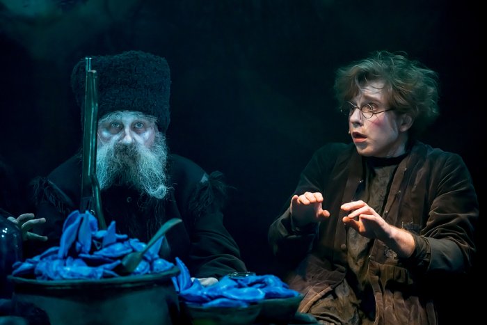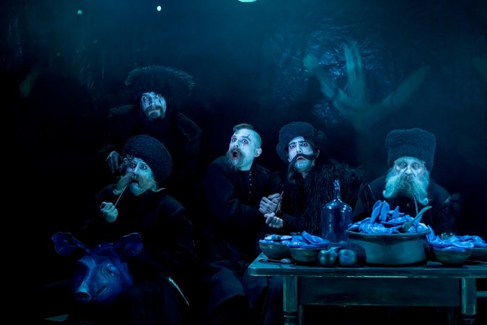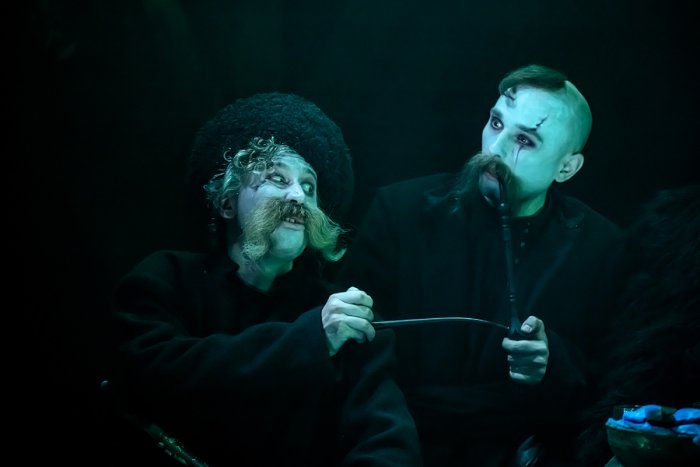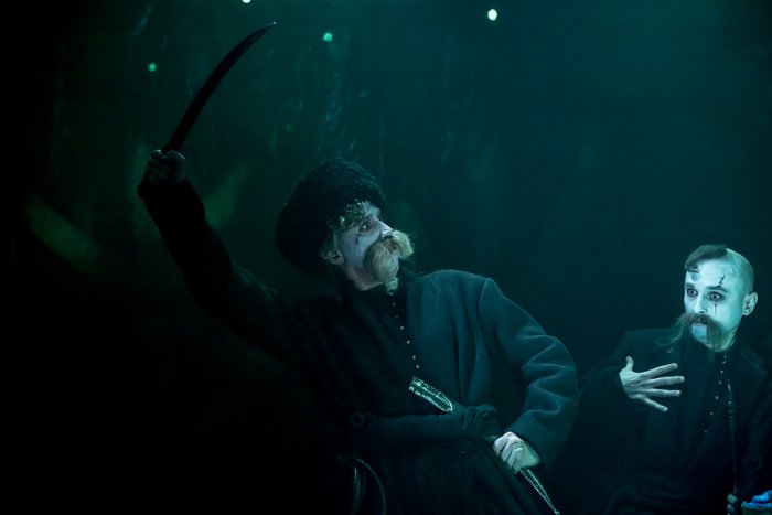 Первой нечистью, вышедшей из тьмы, становится старуха-карлица, которая пускает героев к себе в дом. Ее и Панночку играет Маргарита Якимова, которая уже не раз работала с Арсением Мещеряковым, в том числе исполнила главную роль в спектакле «Дни нашей жизни». У этой постановки есть что-то общее с «Вием». В обеих работах, сделанных в рамках театра масок, режиссер то ускоряет, то замедляет действие. Поэтому разговоры с казаками тянутся вечность, а сцены с Панночкой проносятся, как в бреду.