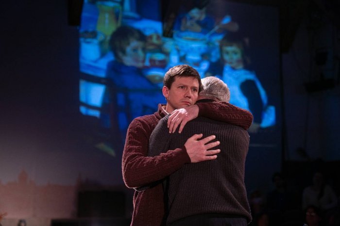 Вторая часть постановки (уже по рассказу Юрия Казакова) не похожа на первую. «Свечечка» — это сценическая исповедь, напряженный монолог отца, обращенный в прошлое. Перед нами противопоставление: отец (Дмитрий Ячевский) вербально и глубоко выражает свои мысли, реконструирует прошлое, пока сын (Павел Степанов) безмолвствует и реагирует на услышанное только пластически. Он активно занят бытовой рутиной, а перед зрителями наглядно ускользает время. В конце папа, обращаясь к своему ребенку, восклицает: «Да ты сам свечечка!». И в зале не остается того опустошения, которое возникло после прощания с голубями. Любовь родителя к ребенку показана как свет, волшебное сияние, которое возвращает желание жить. Этот крошечный огонек в финале — символ тепла, способного разогнать холод самого глубокого одиночества.