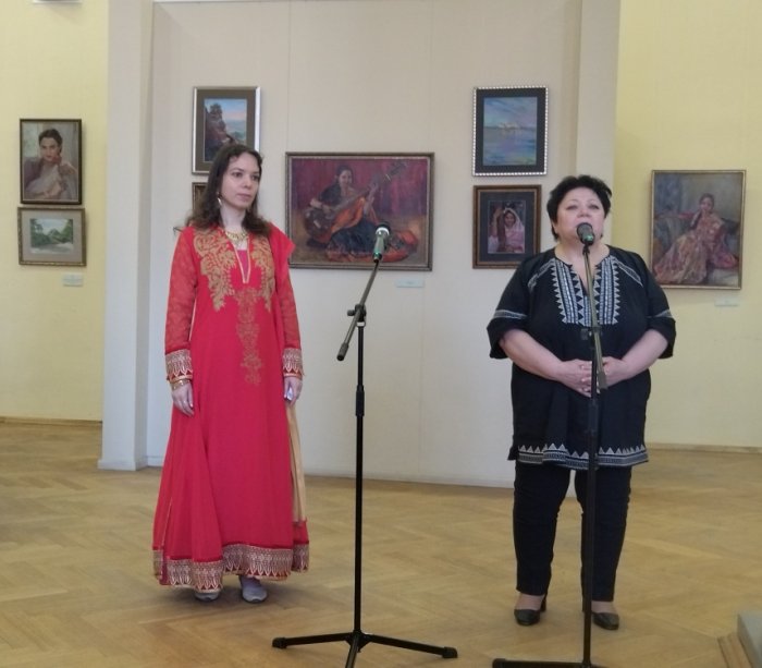 На открытии. Художница Шанти Кушваха и директор Музейного центра РГГУ Ирина БакановаПосле вступительных речей состоялась культурная программа: воспитанники Студии академического вокала РГГУ под руководством Ольги Рудаковой исполнили русские народные песни, а победительница конкурса «Голос Индии» Сунандита Нипа из Дакки спела песни из популярных кинофильмов на хинди под аккомпанемент фисгармонии.