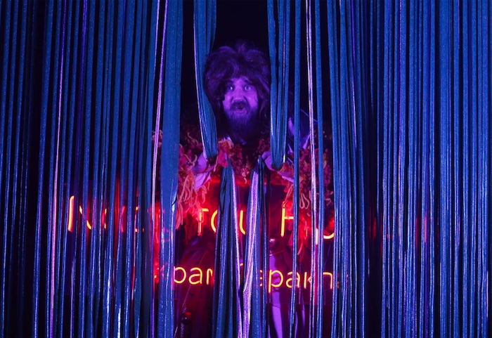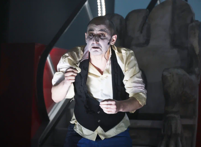 Экспериментально и само пространство сцены, довольно лиминальное, черное-красное, в котором практически отсутствуют декорации. На сцене есть два неработающих эскалатора («Аид не создан для удобства»), а тему задают неоновые лампы, меняющие свой свет в зависимости от задачи.