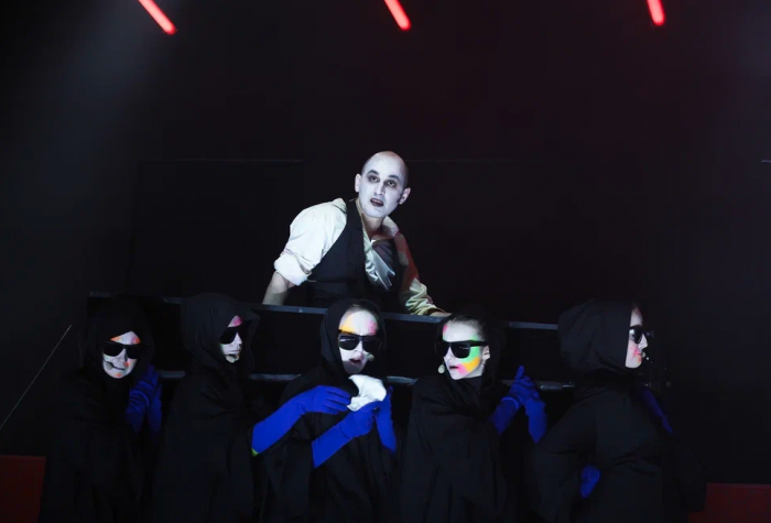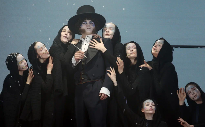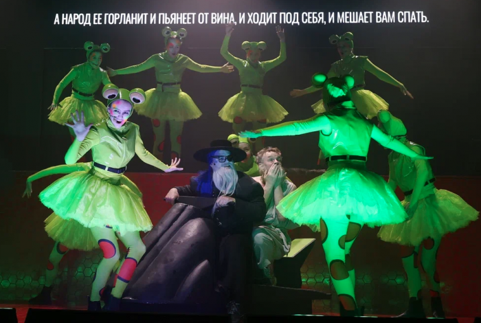Спектакль «Лягушки» – эксперимент, форма, ставшая основной в МГТ в этом сезоне. В комедию Аристофана добавляются новые герои и сцены: разговор с мамами, героиня Марии Каллас, голос Гомера (Сергей Безруков) и… Александр Сергеевич Пушкин.