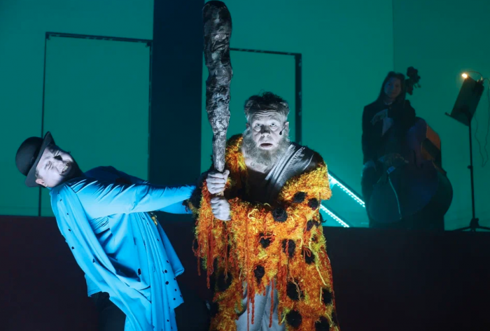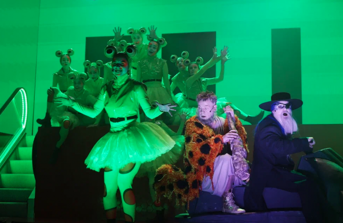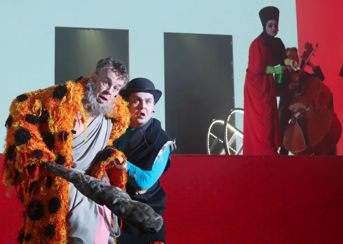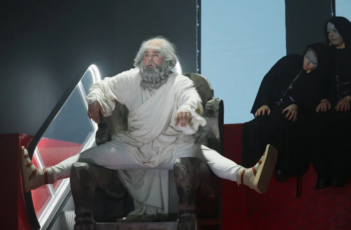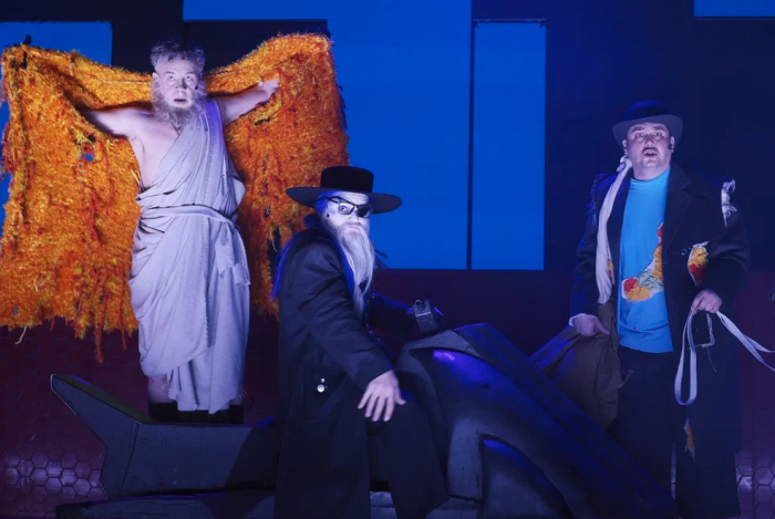 Отдельно стоит сказать про костюмы – Дионис облачен в ярко-желтый халат, как бы львиную шкуру Геракла, Лягушки прыгают в цветных колготках и зеленых юбках, а служанка Персефоны танцует на каблуках и в мини. Однако, при всей экспериментальности, Василиос не забывает и про древнегреческую «классику», как в костюмах (Эсхил и Еврипид одеты в белые греческие хитоны), так и в самой структуре спектакля.