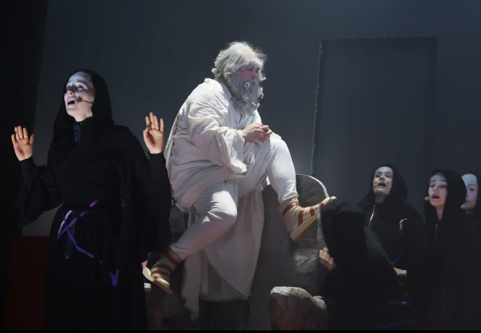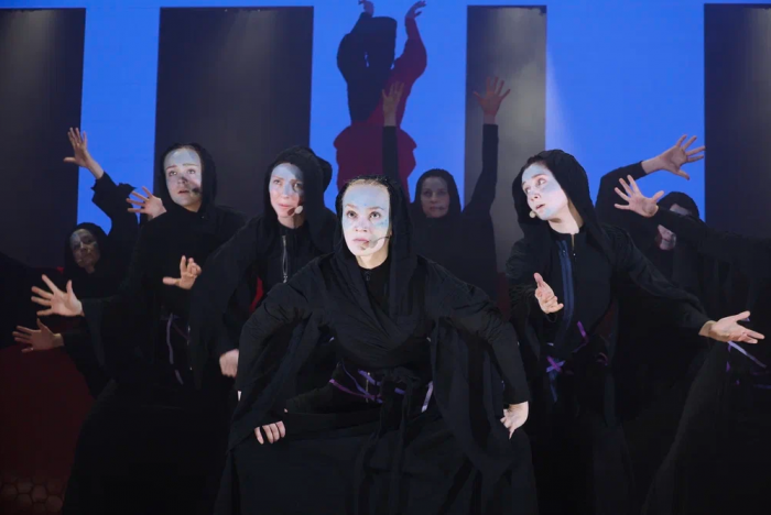 Актеры много поют, и если хор Лягушек обусловлен своей литературной основой, то хор мертвых вдов (поющих и на русском, и на греческом) и Мария Каллас – чистая выдумка режиссера. Музыку, которая исполняется прямо на сцене, написал Теодор Абазис, который когда-то был преподавателем Василиоса Самуркаса, а теперь создает спектакль уже вместе с ним.