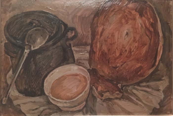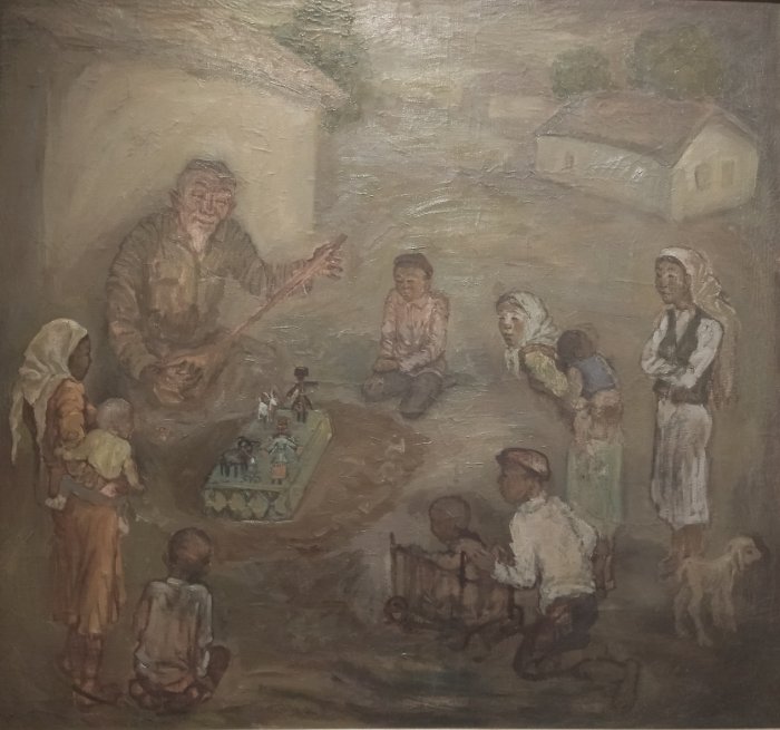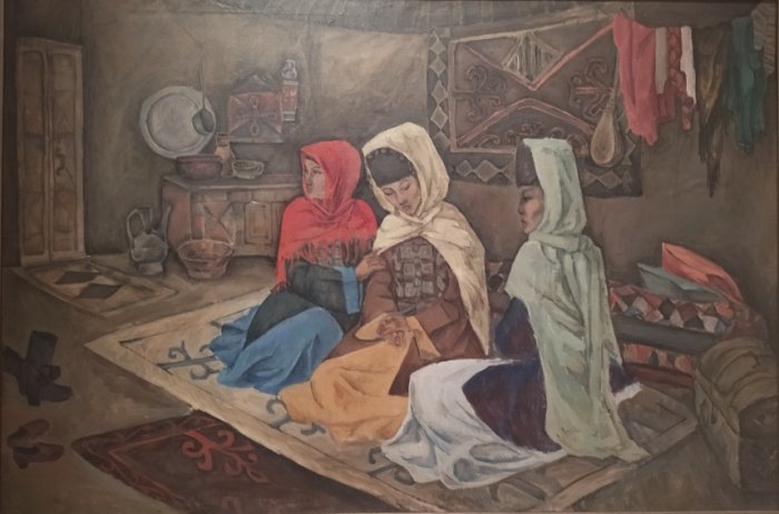 «Терме»Особого внимания заслуживает картина «Ортеке», изображающая вид традиционного исполнительского искусства ногайцев, в 2022 году официально включенного в список нематериального культурного наследия ЮНЕСКО. Ортеке – это выступление домбриста, к пальцам которого привязаны нити, приводящие в движение игрушечного козла, танцующего в такт музыке. Особое мастерство исполнителя заключается в умении сочетать сложную технику игры на домбре с управлением движениями куклы. На картине можно видеть, как дети всех возрастов, не избалованные развлечениями, собрались вокруг седобородого музыканта и с интересом смотрят представление.
