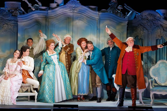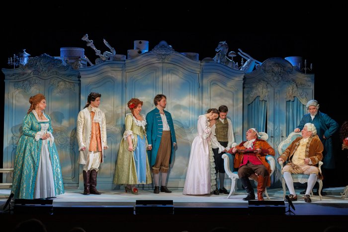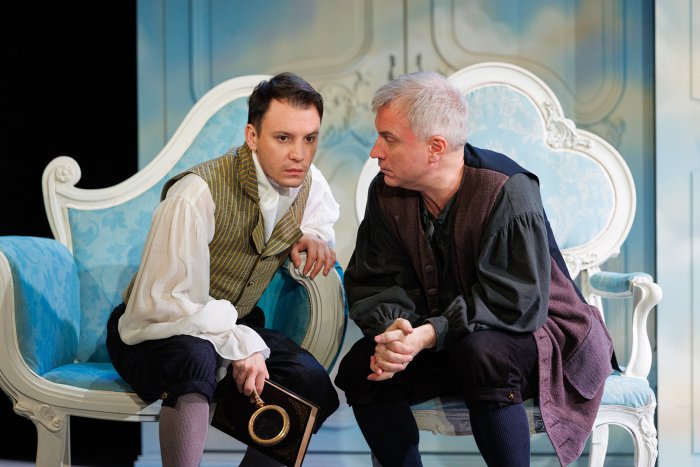 Заслуживает особого внимания общий антураж спектакля, выдержанный в духе «золотого века русского дворянства». Привлекают внимание вышитые в лучших традициях екатерининской эпохи камзолы, фраки и кафтаны, корсажи и пышные платья. Бросается в глаза и светло-голубой многостворчатый шкаф, который служит главным локусом действия: персонажи то скрываются в его глубине, то вновь появляются, задавая ритм происходящему. В напряжённые моменты шкаф приобретает янтарное свечение, местами переходящее в тёмно-коричневые оттенки. Создание этого выразительного пространства – заслуга художника-постановщика Марии Шуплецовой и художника по свету Нарека Туманяна. Двораброд символично носит одежду лишь темных оттенков и надевает во втором действии красный камзол, который становится ярким, выбивающимся акцентом на фоне шкафа, расписанного облаками, и образов героев в самых светлых пастельных тонах.