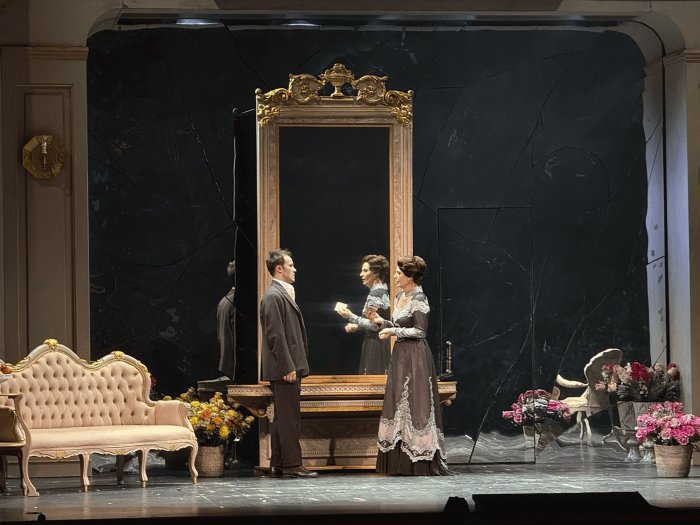 Оркестр берёт тревожные ноты. Свет гаснет. Занавес открывается. На фоне пыльно-голубых обоев выделяется золотой граммофон. Стол, на котором впоследствии появится букет бело-синих цветов, как и кушетка, покрыт кружевной тканью. На стенах поверх обоев – осколки зеркал (они ещё найдут своё отражение в интерьере спектакля). Комната кажется милой, но изначально вызывает беспокойство. И не просто так: именно в этих стенах героине сообщат самые трагичные для неё известия. Из этой комнаты хозяйка её, девица Отрадина (роль Арины Осиповой), выйдет совершенно другим человеком.