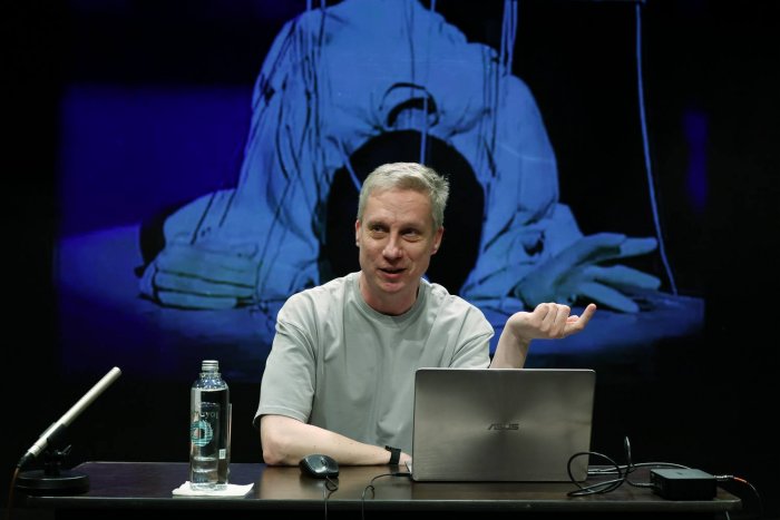 Среди тем, обсуждавшихся на лекции, — взаимодействие куклы и артиста. Сегодня спектакли, в которых артисты находятся за ширмой, а зритель видит только марионеток, становятся редкостью. Часто на сцене артист управляет сразу несколькими персонажами, вступает в диалог со своим «подопечным» или даже «раздваивается», то играя самостоятельную роль, то становясь передатчиком реплик куклы.